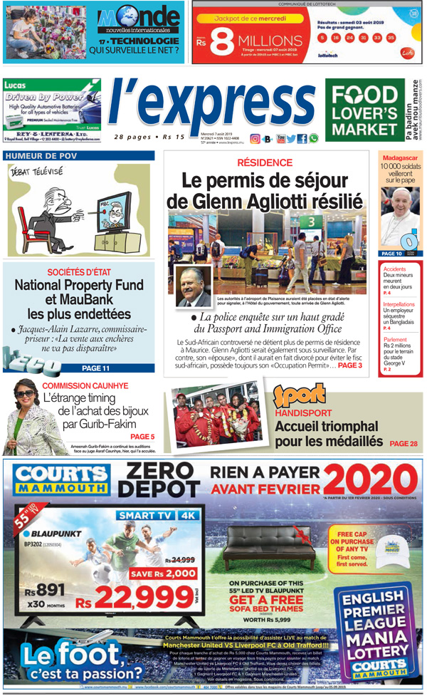 En une : Résidence – Le permis de séjour de Glenn Agliotti résilié ; Commission Caunhye – L’étrange timing de l’achat des bijoux par Gurib-Fakim ; Accidents – Deux mineurs meurent en deux jours
