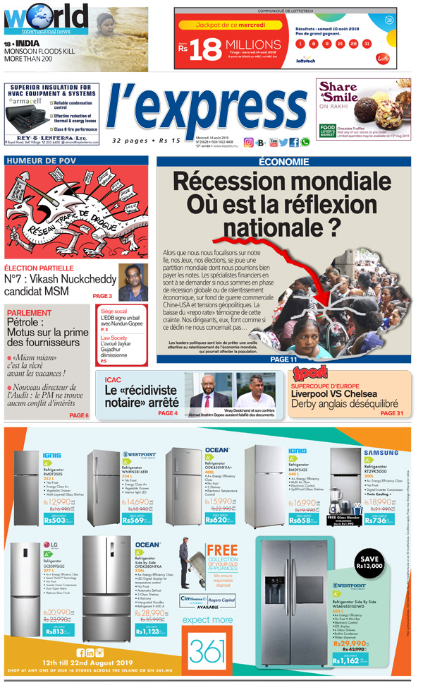 En une - Récession mondiale: Où est la réflexion nationale ? Autre titre - Élection partielle au n°7: Vikash Nuckcheddy candidat MSM.