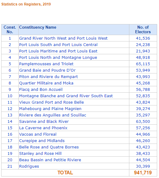 Le n°5 est également la circonscription avec le plus grand nombre d’électeurs à 65 115. En deuxième position, le n°14, Savanne/Rivière-Noire, avec 63 500 électeurs. Suivie des 57 256 électeurs du n°15, La Caverne/Phoenix. Si ces trois circonscriptions ont tous vu une hausse du nombre des électeurs, d’autres ont vu une baisse. Comme au n°3, Port-Louis maritime/Port-Louis Est, qui passe de 23 112 électeurs pour les législatives de 2014 à 21 943 cette année.