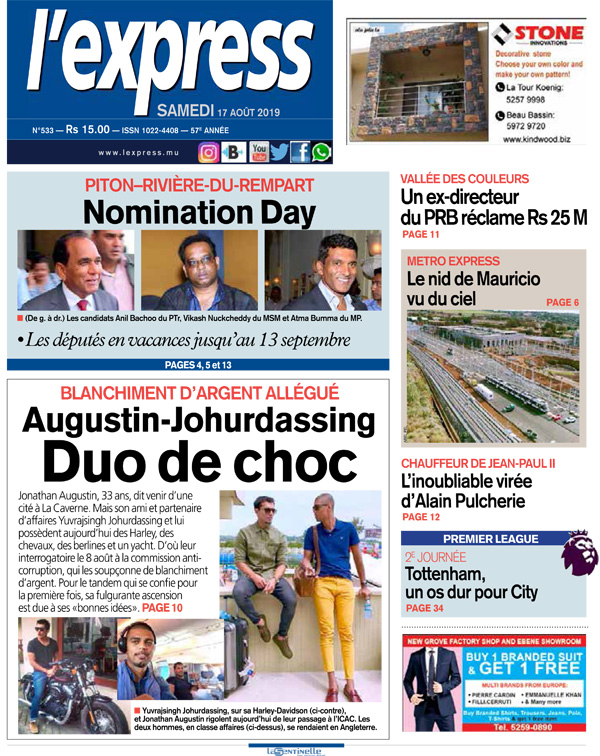 En une - Blanchiment d’argent allégué: Augustin-Johurdassing Duo de choc ; Autre titre: Piton–Rivière-du-Rempart: Nomination Day.