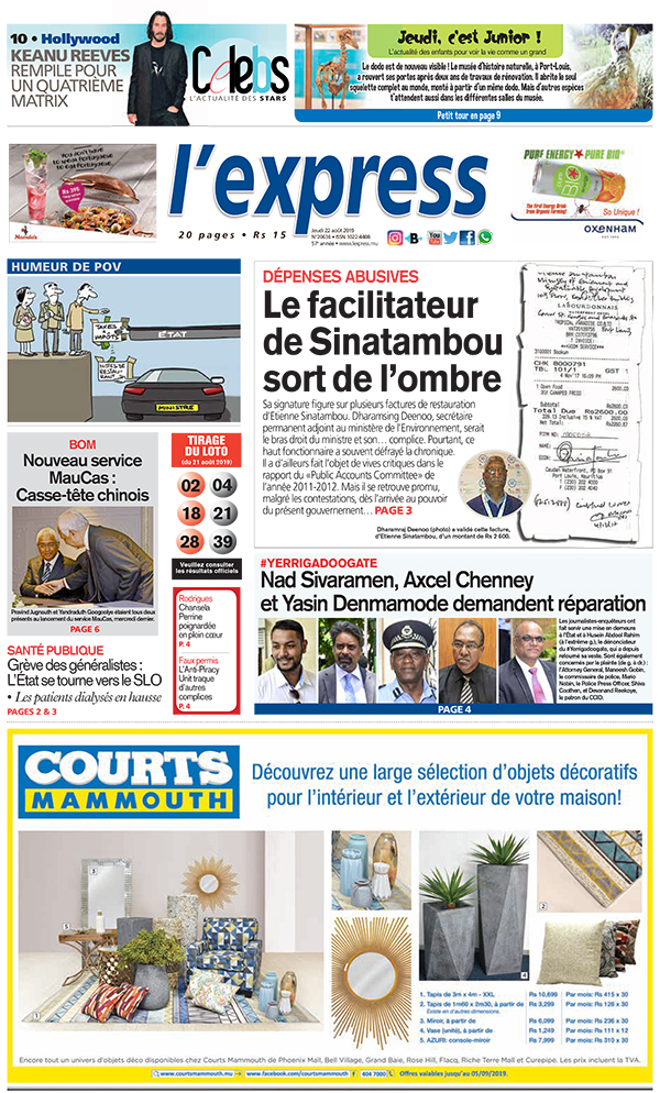 Les grands titres de l’express de ce jeudi 22 août 2019