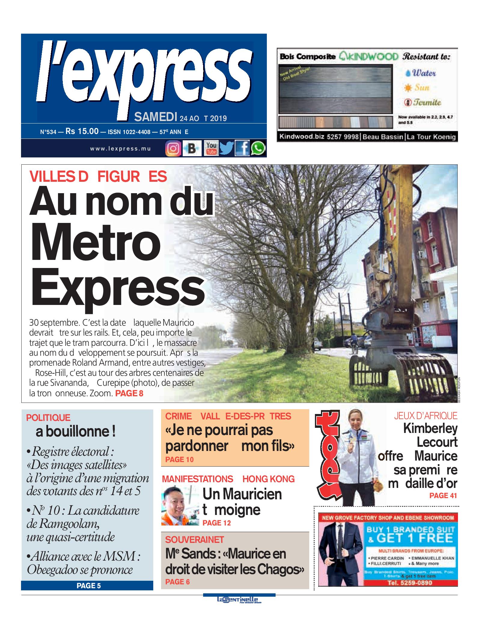En une : Villes défigurées – Au nom du Metro Express ; Politique – Ça bouillonne ! – Crime à Vallée-des-Prêtres – «Je ne pourrai pas pardonner à mon fils»