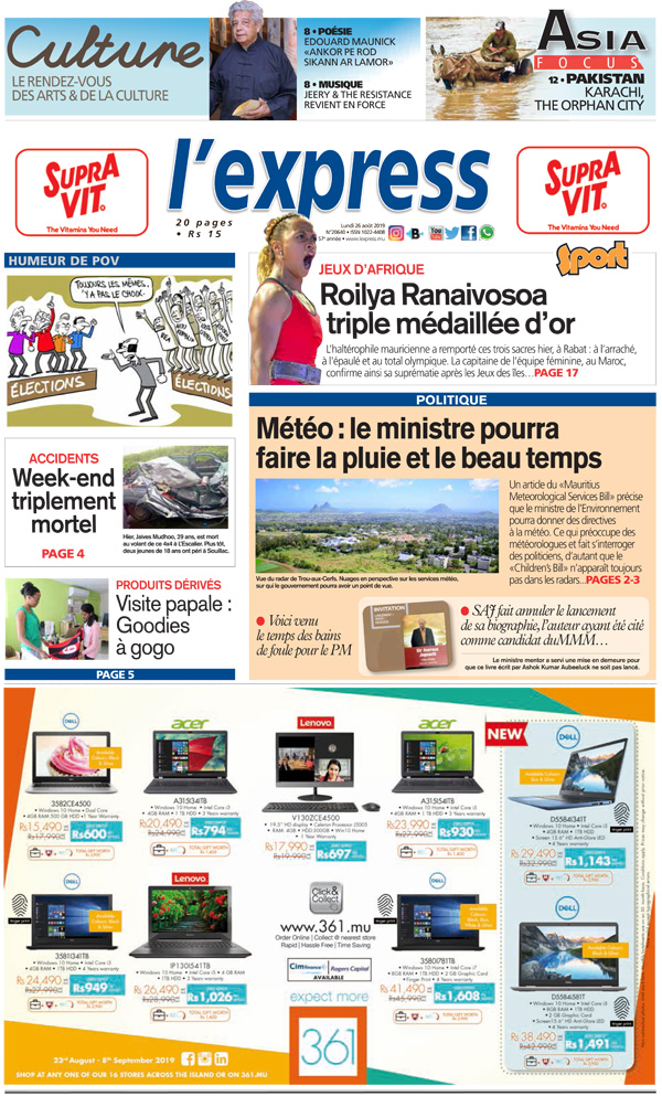 En une - Jeux d’Afrique: Roilya Ranaivosoa triple médaillée d’or; Autre titre: Météo: le ministre pourra faire la pluie et le beau temps.