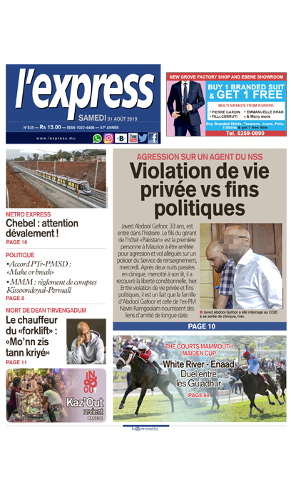 En une de l’express de ce samedi 31 août - Agression sur un agent du NSS : violation de vie privée vs fins politiques. Autre titre – Mort de Dean Tirvengadum: «Mo’nn zis tann kriyé», dit le chauffeur du «forklift»