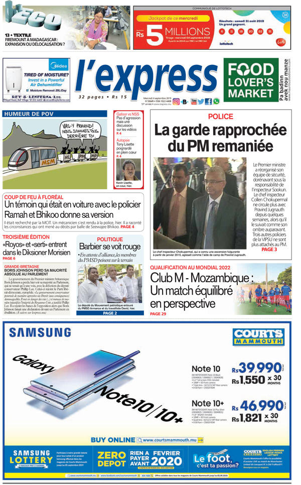 En une de l’express de ce mercredi 4 septembre : la garde rapprochée du PM remaniée. Autre titre – Coup de feu à Floréal : un témoin qui était en voiture avec le policier Ramah et Bhikoo donne sa version des faits.