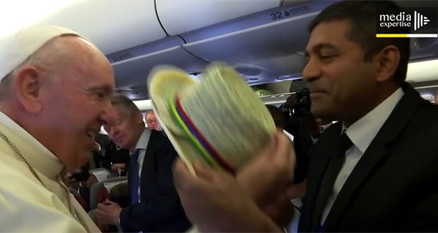 «C’était comme-ci le temps s’arrêtait. J’étais comme dans une bulle avec le pape. Quand il a accepté que je lui fasse essayer ce chapeau, eh bien je n’ai pas hésité une seconde. Et à cet instant, j’ai vraiment pensé fort à mon pays. C’était très émouvant de le voir porter nos couleurs et j’étais très heureux de parler de Rodrigues à tous les confrères qui ont vu ce moment dans l’avion. Cela fait plusieurs semaines que je réfléchis aux cadeaux que Media Expertise, mon entreprise, pourrait offrir au pape et il fallait que ce soit accepté par la sécurité. Etant bi-national suisse et mauricien, je souhaitais lui faire deux cadeaux. Pour la Suisse, j’ai approché un artisan chocolatier, David Pasquier, que le pape François connaît. Il a préparé ce qu’il fait parvenir au Saint-Père chaque année : des ganaches au chocolat au lait et au chocolat noir. David Pasquier a aussi fait une plaque avec une partie du logo mauricien de la visite : pèlerin de la paix. C’est mon épouse Véronique qui m’a donné l’idée du cadeau pour Maurice. Elle m’a dit que c’était l’occasion de mettre Rodrigues à l’honneur. Marie-Michèle Etienne a fait tout le reste, trouvé les bonnes personnes sur place jusqu’à l’acheminement de ce chapeau en Suisse. Je leur en suis très reconnaissant. Merci à la Compagnie des Artisans de Rodrigues pour ce chapeau en vétiver qui porte aussi une représentation de l’île Rodrigues. Le bord est en jaune et blanc, couleurs du Vatican. Je suis heureux de savoir que ce geste a fait plaisir à mes compatriotes. Mission accomplie !»