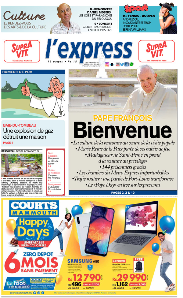 En une: Bienvenue, pape François ! Le jour historique est enfin arrivé ! Le pape arrive aujourd’hui ! Autre titres : Bras-d’Eau: des filaos abattus.