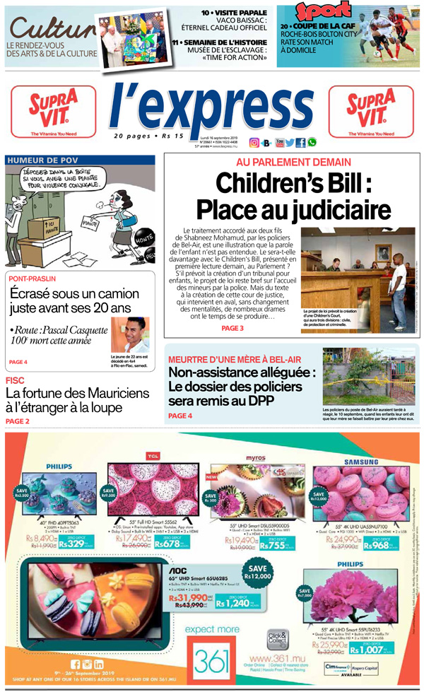 En une – Au Parlement demain - Children’s Bill: place au judiciaire ; Autre titre: Meurtre d’une mère à Bel-Air - Non-assistance alléguée : le dossier des policiers sera remis au DPP.