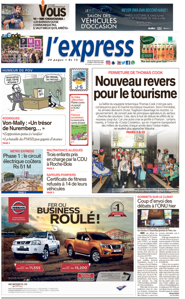 En une de l’express de ce mardi 24 septembre - Fermeture de Thomas Cook : nouveau revers pour le tourisme. Autre titre - Sommets sur le climat : coup d’envoi des débats à l’ONU hier.