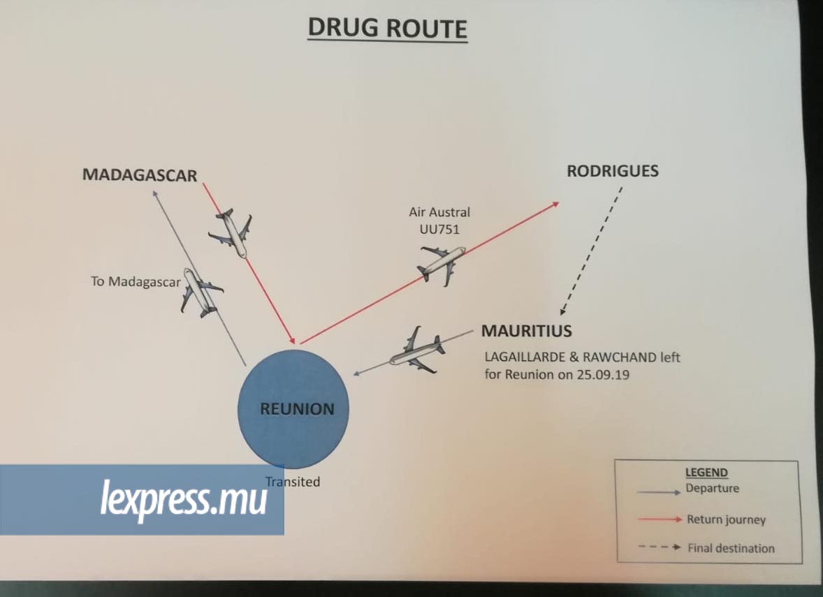 Ils l’auraient dissimulée dans leur estomac et ont repris l’avion pour transiter à La Réunion avant d’embarquer pour Rodrigues. Ils devaient remettre 288,64 g d’héroïne, sous forme de trente boulettes d’une valeur marchande de Rs 4 329 600, à Teosand Perle, alias Bruno Bawa, un éleveur de porcs de 45 ans et présumé trafiquant domicilié à cité Bois-Marchand. La drogue trouvée sur le suspect Lagaillarde pesait 143,64 g et celle sur Nicolas Rawchand 145 g.