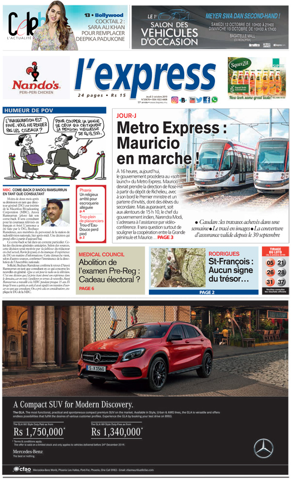 En une - Metro Express: Mauricio en marche ! Autre titre; Rodrigues - St-François: aucun signe du trésor…