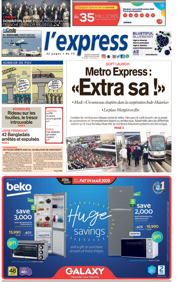 En une : Soft Launch – Metro Express – «Extra sa !» ; Rodrigues – Rideau sur les fouilles, le trésor introuvable ; Usine Firemount – 42 Bangladais arrêtés et expulsés.