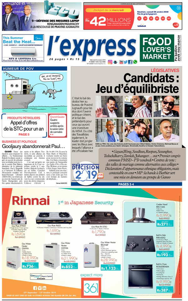 Les grands titres de l’express de ce mercredi 9 octobre 2019