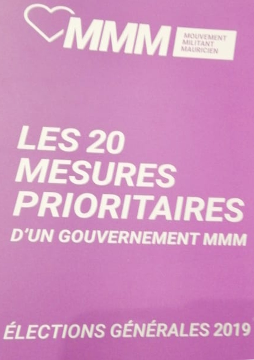 Le Mouvement militant mauricien (MMM) a rendu publiques ses 20 mesures prioritaires si les Mauves sont élus. Parmi elles, la pension de vieillesse qui sera alignée sur le salaire minimum ou encore une allocation chômage de Rs 5 000 aux jeunes de 18 à 25 ans. Ci-dessus les 20 mesures proposées.