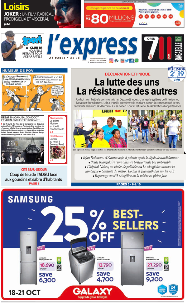 En une de l’express de ce vendredi 18 octobre : Déclaration ethnique - Lalit et Rezistans ek Alternativ mène chacun leur combat. Autre titre : Cité Hibiscus souhaite un dernier au revoir à Sorenza René.
