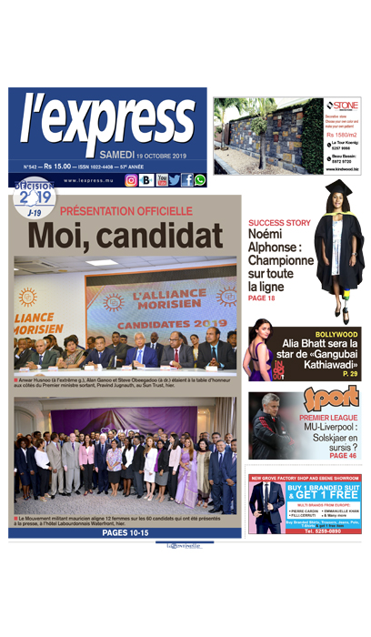 En une : Présentation officielle – Moi, candidat ; No18 – Xavier-Luc Duval promet de rembourser les victimes de la BAI ; Vacoas – Pravind Jugnauth fait les yeux doux aux chauffeurs de taxi.