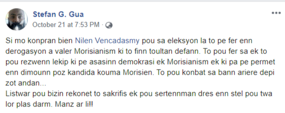 Une candidature qui dérange est celle de Nilen Vencadasmy. A la veille du Nomination Day, Stefan Gua de Rezistans Ek Alternativ lui lançait ceci : «Si mo konpran bien pou sa eleksyon la to pe fer enn derogasyon a valer Morisianism ki to finn toultan defann.»
