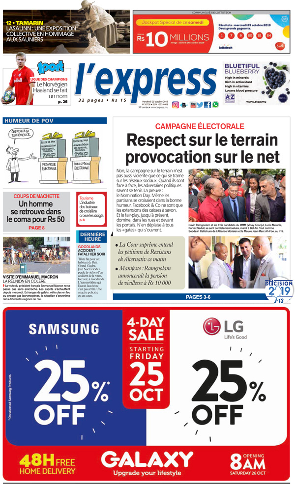 Les grands titres de l’express de ce vendredi 25 octobre 2019