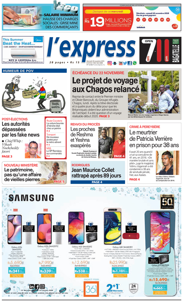 En une de l’express de ce mercredi 20 novembre : Le projet de voyage aux Chagos relancé. Autre titre : le meurtrier de Patricia Verrière écope de 38 ans de prison.