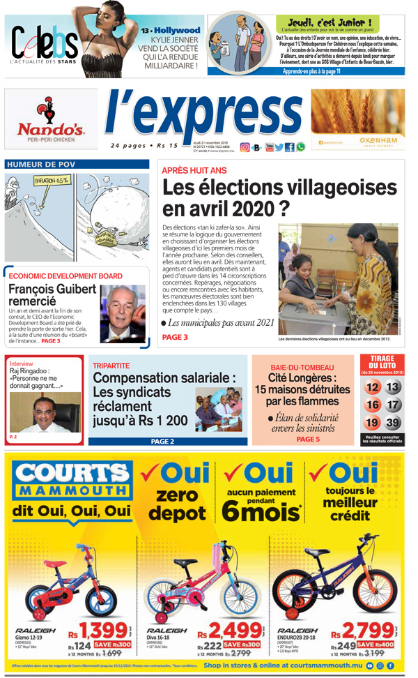 En une: Après huit ans: les élections villageoises en avril 2020 ? Autre titre: Compensation salariale: Les syndicats réclament jusqu’à Rs 1 200.