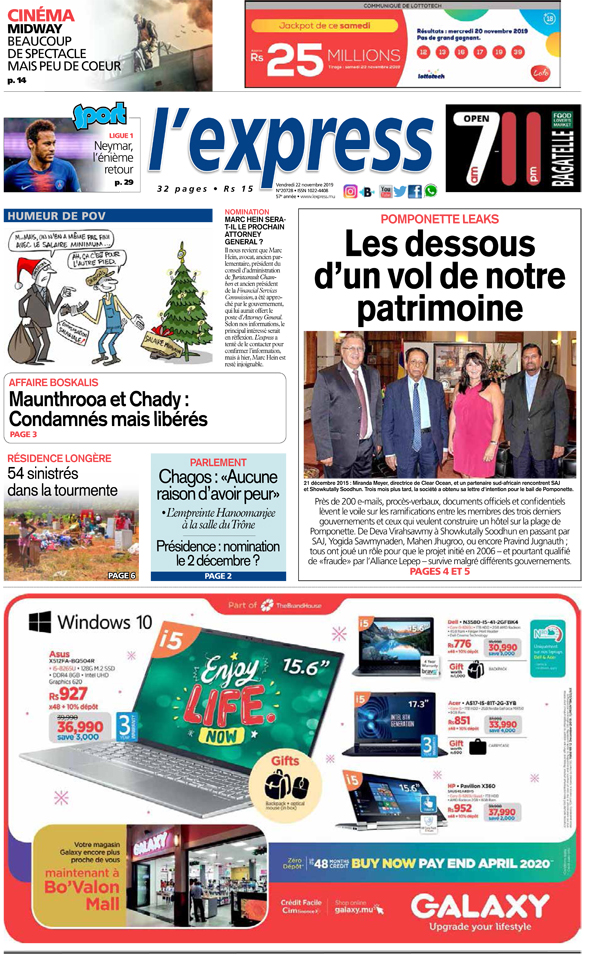 En une : Pomponette Leaks – Les dessous d’un vol de notre patrimoine ; Affaire Boskalis – Maunthrooa et Chady : condamnés mais libérés ; Parlement – Chagos : «Aucune raison d’avoir peur»