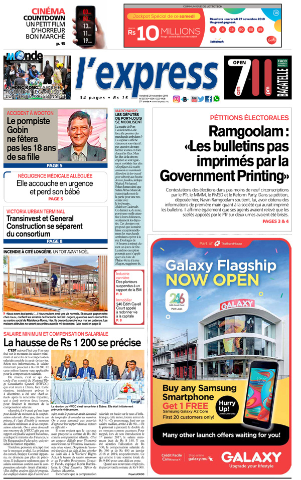En une - Pétitions électorales - Ramgoolam: «Les bulletins pas imprimés par la Government Printing» ; Autre titre : Salaire minimum et compensation salariale: la hausse de Rs 1 200 se précise.
