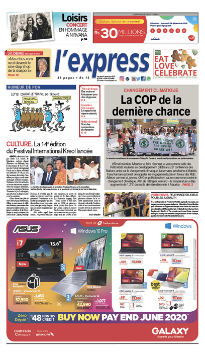 En une de l’express : Changement climatique - la COP de la dernière chance. Autre titre : la 14e édition du Festival International Kreol lancée.
