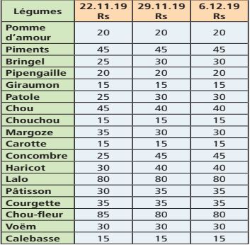 Le prix des légumes est constant pour le moment (voir tableau). Sauf que selon Kreepalloo Sunghoon, il pourrait y avoir une augmentation de leur prix, de l’ordre de 10 %, dès ce week-end. Principales raisons évoquées : la pluie qui se fait désirer et la montée de la température, ce qui a fait baisser la productivité.