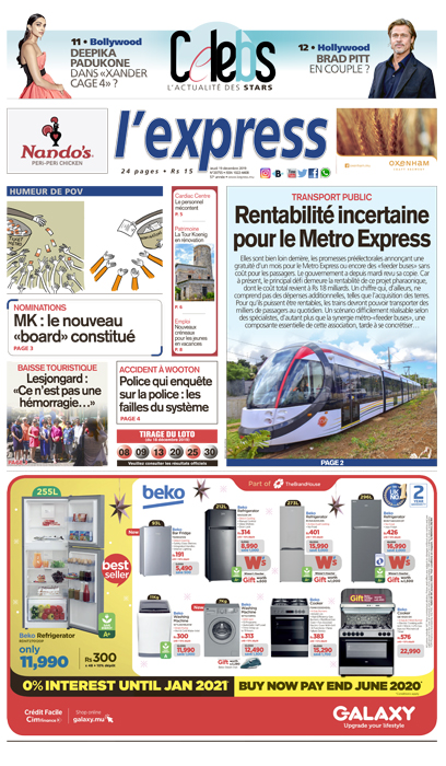 En une : Transport public – Rentabilité incertaine pour le Metro Express ; Accident à Wooton – Police qui enquête sur la police : les failles du système ; Nominations – MK : le nouveau «board» constitué