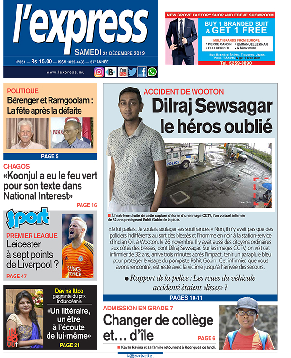 En une de l’express : Dilraj Sewsagar, le héros oublié de l’accident à Wooton. Autre titre : la fête après la défaite pour Bérenger et Ramgoolam. Ou encore - Admission en Grade 7 : changer de collège et… d’île.