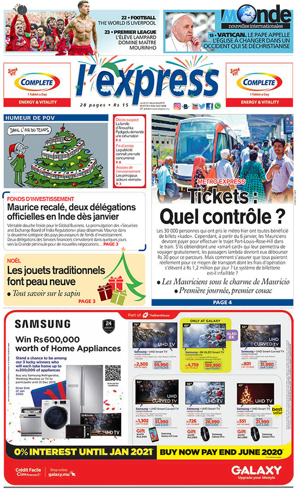 En une de l’express : Metro Express, quel contrôle pour les tickets ? Autre titre : Maurice recalé, deux délégations officielles en Inde dès janvier. Ou encore - Fin d’année : la publicité connaît une rude concurrence.