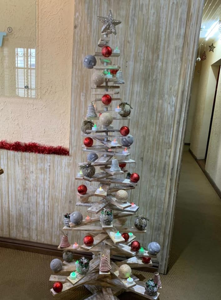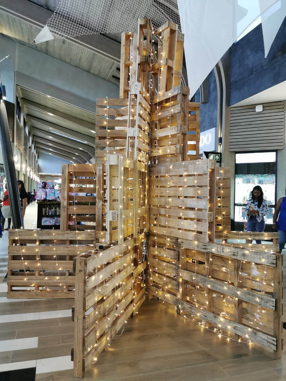 5. Des palettes en chantier, un peu de guirlandes lumineuses, quelques clous et le tour est joué ! Ce sapin grandiose orne l’entrée du Bo’Valon Shopping Mall.
