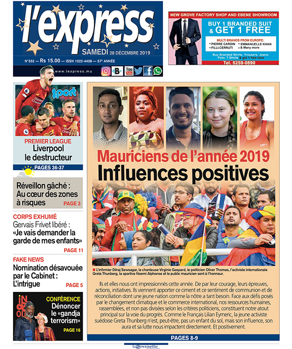 En une : Mauriciens de l’année 2019 – Influences positives ; Corps exhumé – Gervais Frivet : «Je vais demander la garde de mes enfants» ; Réveillon gâché – Au cœur des zones à risques.