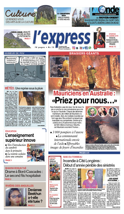 En une : Brasiers géants – Mauriciens en Australie : «Priez pour nous…» ; Éducation – l’enseignement supérieur innove ; Rivière-des-Anguilles – Devianee Beekhun a-t-elle été tuée ?