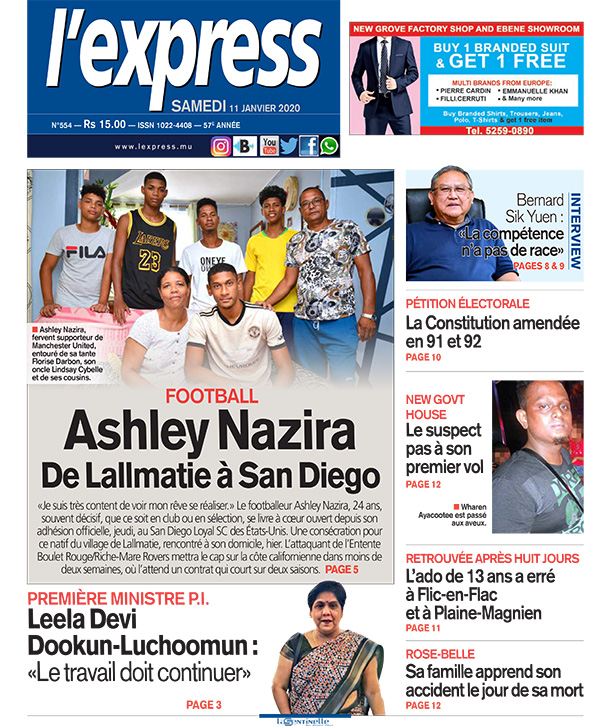En une : Football: Ashley Nazira, de Lallmatie à San Diego; Autre titre: Première ministre P.I. - Leela Devi Dookun-Luchoomun: «Le travail doit continuer».