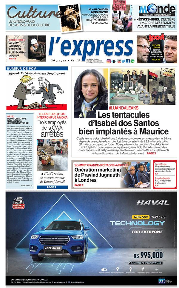 En une: Les tentacules d’Isabel dos Santos bien implantés à Maurice ; Autre titre: Météo : Deux formations cycloniques guettent notre île.