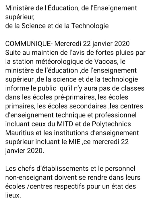 Un avis de fortes pluies est en vigueur à Maurice, selon le communiqué de la météo émis en ce mercredi 22 janvier. De ce fait, il n’y a pas école aujourd’hui. On le répète, il n’y a ni école, ni cours en ce mercredi 22 janvier 2020, comme le stipule le communiqué du ministère de l’Education. Pour ce qui est des garderies, nous essayons d’obtenir des infos à ce propos.