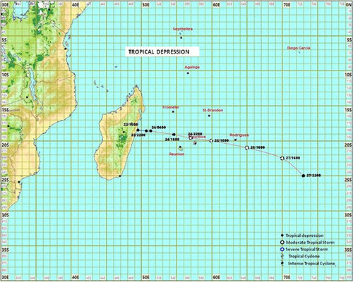 A 10 heures, la dépression tropicale était centrée à environ 550 km à l'ouest-nord- ouest de Maurice, soit en latitude 18.8 degrés Sud et longitude 52.8 degrés Est.
