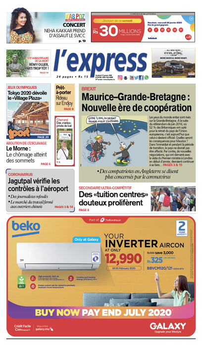 En une : Brexit : Maurice – Grande-Bretagne, nouvelle ère de coopération ; Secondaire ultra-compétitif – Des «tuition centres» douteux prolifèrent ; Coronavirus – Jagutpal vérifie les contrôles à l’aéroport.