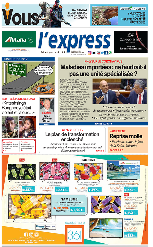 En une - Maladies importées: ne faudrait-il pas une unité spécialisée ? Autre titre - Riz Basmati: «Détecter» le bon grain de l’ivraie. Ou encore, Hommage: adieu Sir Victor Glover.