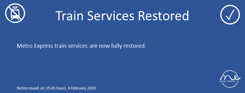 Un nouveau communiqué émis par Metro Express Ltd stipule que tous les trains, qui étaient à l’arrêt suite à un problème technique, il y quelques instants, sont de nouveau opérationnels.