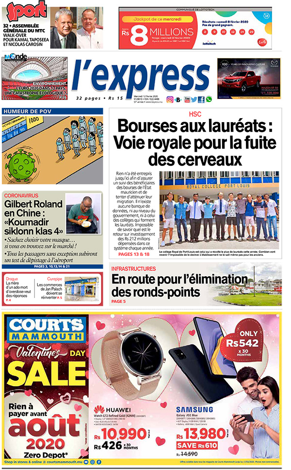 En une de l’express – bourses aux lauréats : voie royale pour la fuite des cerveaux. Autre titre : «koumadir siklonn klas 4», dit Gilbert Roland, bloqué en Chine. Ou encore : en route pour l’élimination des ronds-points.