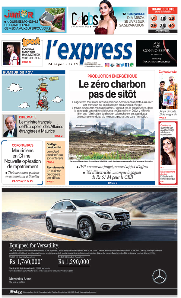 En une de l’express, Production énergétique: le zéro charbon pas de sitôt. Autre titre : Sushmita Sen rend hommage à la femme mauricienne. Ou encore, Mauriciens en Chine: nouvelle opération de rapatriement.