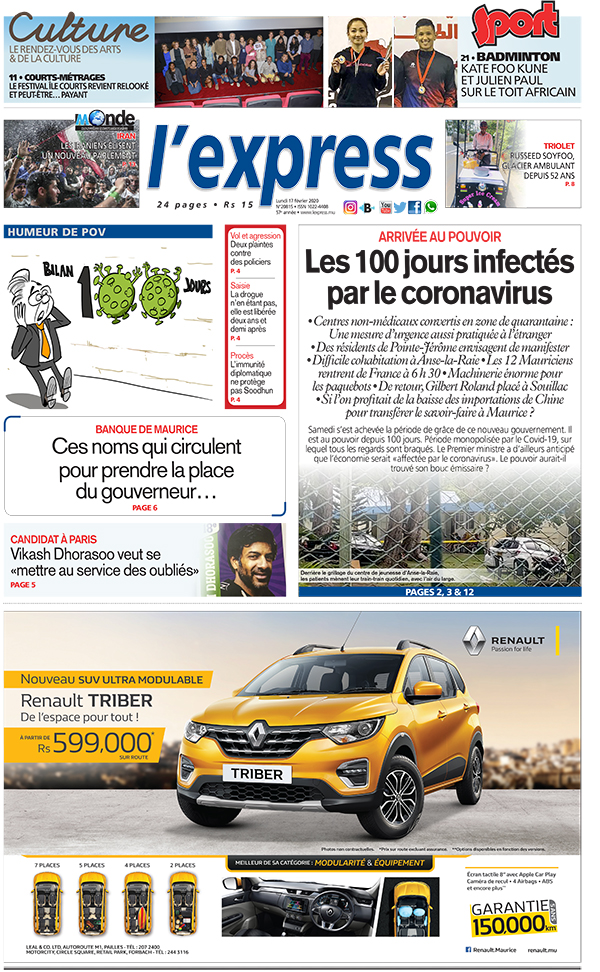 En une : Arrivée au pouvoir – Les 100 jours infectés par le coronavirus ; Banque de Maurice – Ces noms qui circulent pour prendre la place du gouverneur ; Candidat à Paris – Vikash Dhorasoo veut «se mettre au service des oubliés».