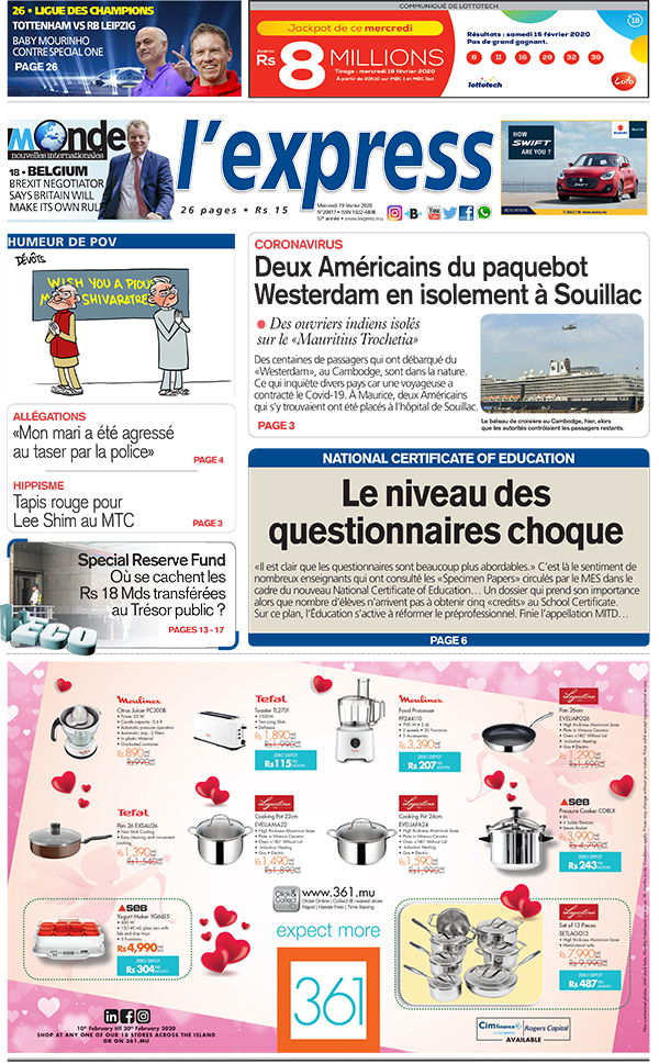 En une - Coronavirus: deux Américains du paquebot Westerdam en isolement à Souillac. Autre titre, National Certificate of Education: le niveau des questionnaires choque.