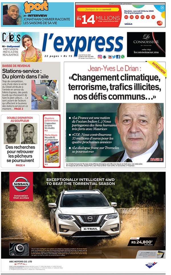 En une de l’express - Jean-Yves Le Drian : «Changement climatique, terrorisme, trafics illicites, nos défis communs…». Autre titre, Stations-service: du plomb dans l’aile. Ou encore, double disparition au Souffleur.