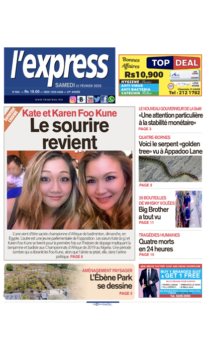 En une de l’express - Kate et Karen Foo Kune: Le sourire revient. Autre titre : Voici le serpent «golden tree» vu à Appadoo Lane. Ou encore, Aménagement paysager: L’Ébène Park se dessine.