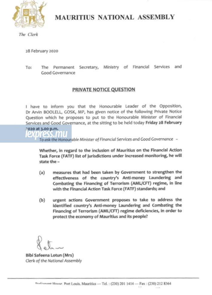 Parlement: la PNQ sur l’inclusion de Maurice sur la «liste grise» des risques de blanchiment