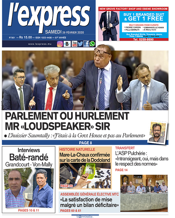 En une de ce samedi 29 février 2020 : Parlement ou hurlement Mr «Loudspeaker» sir. Autre titre : l’ASP Pulchérie : «Intransigeant, oui, mais dans le respect des normes».
