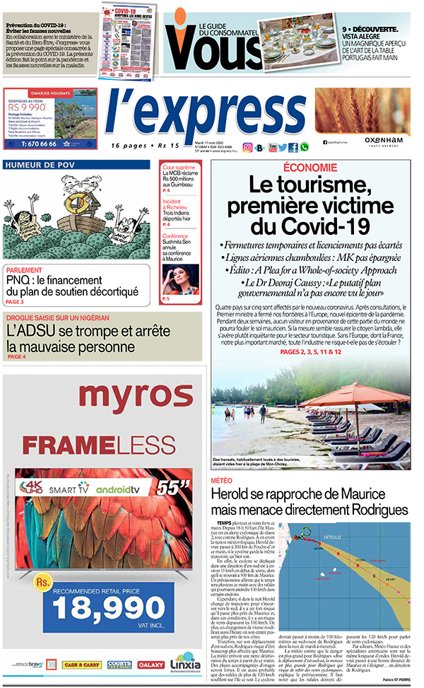 En une : Le tourisme première victime du Covid-19. Autre titre, L’ADSU se trompe et arrête la mauvaise personne. Ou encore, Météo: Herold se rapproche de Maurice mais menace directement Rodrigues.